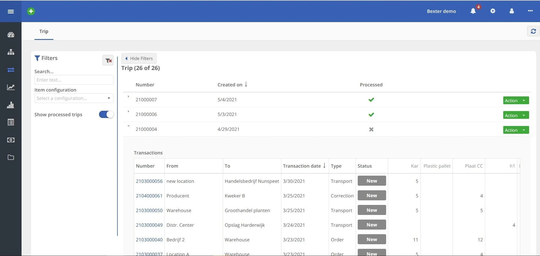 Get insight into the different types of packaging per truck with trip management in TrackOnline. During one trip, a carrier often passes different locations. When packaging is picked up at these locations, it can be combined into one trip. This makes it easy to retrieve information by using a common trip number.