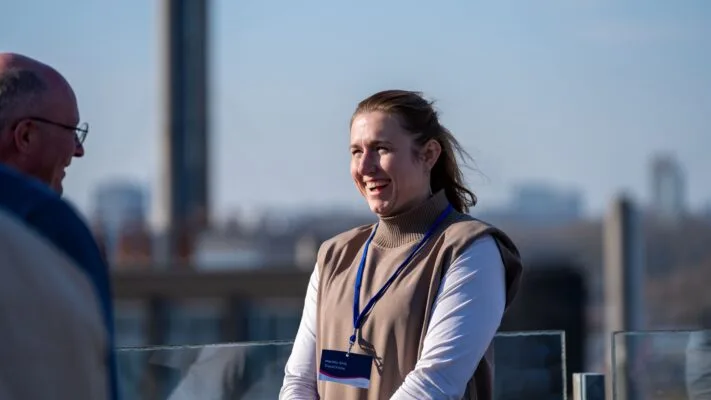 The day quite literally started with a climb. 100 steps up to the event hall, and for the real go-getters, another 32 steps to the rooftop terrace. We had already warned everyone about this in the invitation, but it’s still a surprise when you find yourself needing a break halfway up. Fortunately, there was a bar waiting at the top to help with the sudden lack of oxygen. And that wasn’t all – with the beautiful weather, the rooftop offered a breathtaking view over Delft. A perfect moment to catch your breath, take it all in, and get ready for an afternoon full of insights and inspiration.